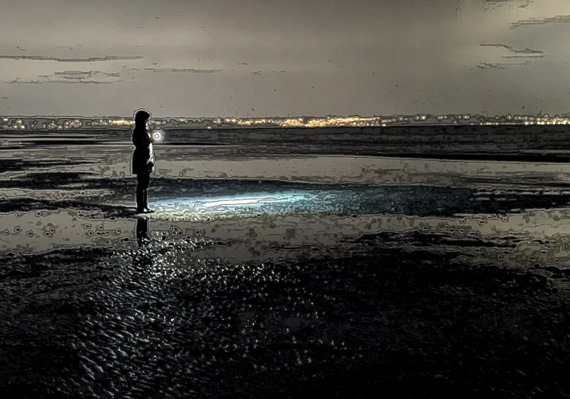 “Encore sur la plage, je marche vers elle dans une cadence de rêveur, de promeneur solitaire, je m’amuse à éviter de mettre le pied sur les taches de lumière scintillante. Comme enfant j’évitais de poser le pied sur les craques dans les trottoirs. Je me faufile entre les sources lumineuses sans y toucher, prudemment, méthodiquement, respectueusement, comme si elles étaient toutes des poissons de glace revenus.